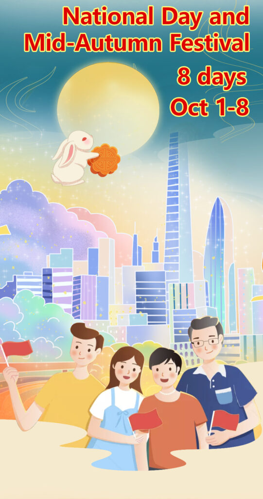 In 2025, China’s National Day holiday, combined with the Mid-Autumn Festival, will be had a holiday from October 1 to October 8, lasting 8 days total. This National Day «Golden Week» holiday starts on October 1 and includes an extended break due to the overlap with Mid-Autumn Festival on October 6. There are also adjusted working days to accommodate the long holiday, including work on September 28 (Sunday) and October 11 (Saturday) to compensate for the extended holiday period.